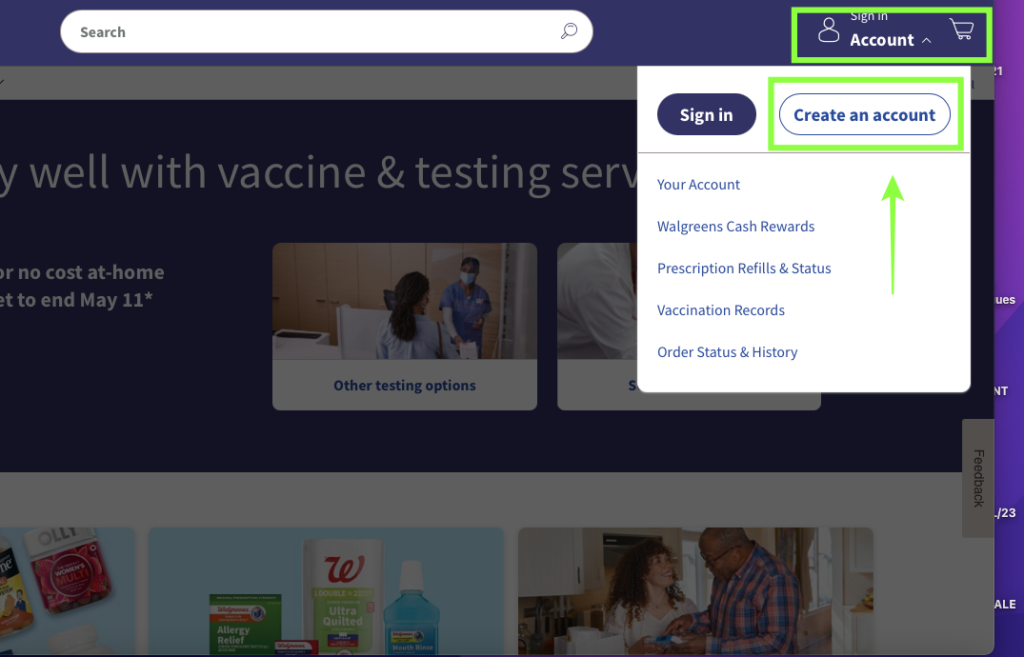 1-) Acesse Diretamente o Site do Walgreens: No canto superior do site, clique em Account e depois em Create an Account